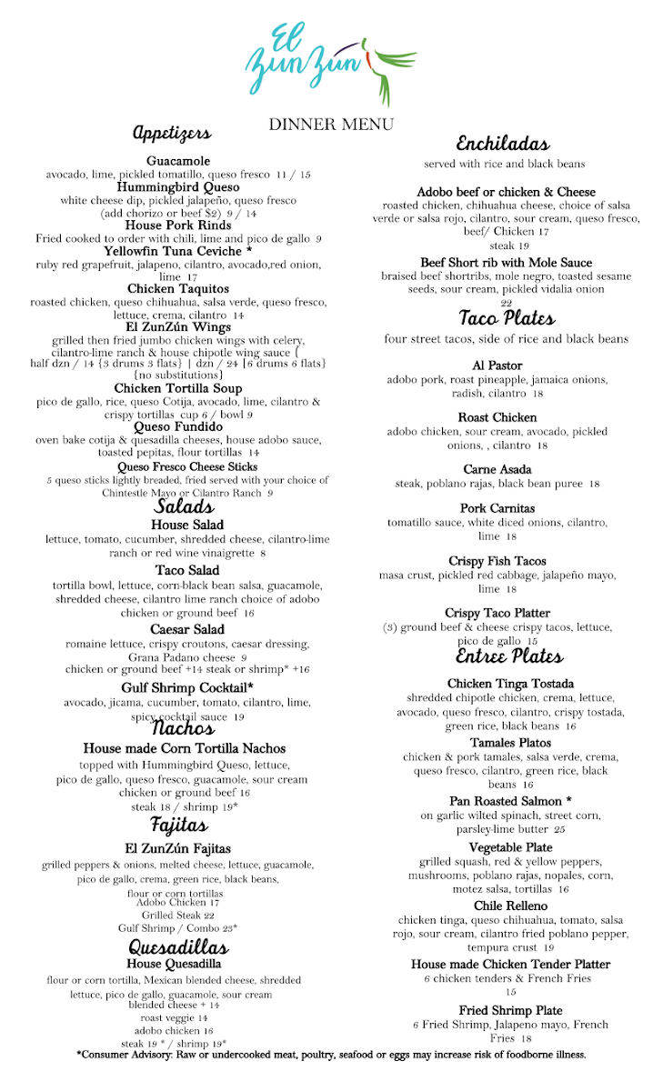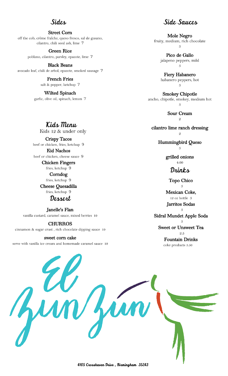 El ZunZún offers a menu that embraces the vibrant, comforting flavors of authentic Mexican cuisine in a relaxed, inviting setting. The selection blends casual bites with hearty plates, making it easy to enjoy a variety of occasions — from a quick lunch to a laid-back dinner with friends or family gatherings.